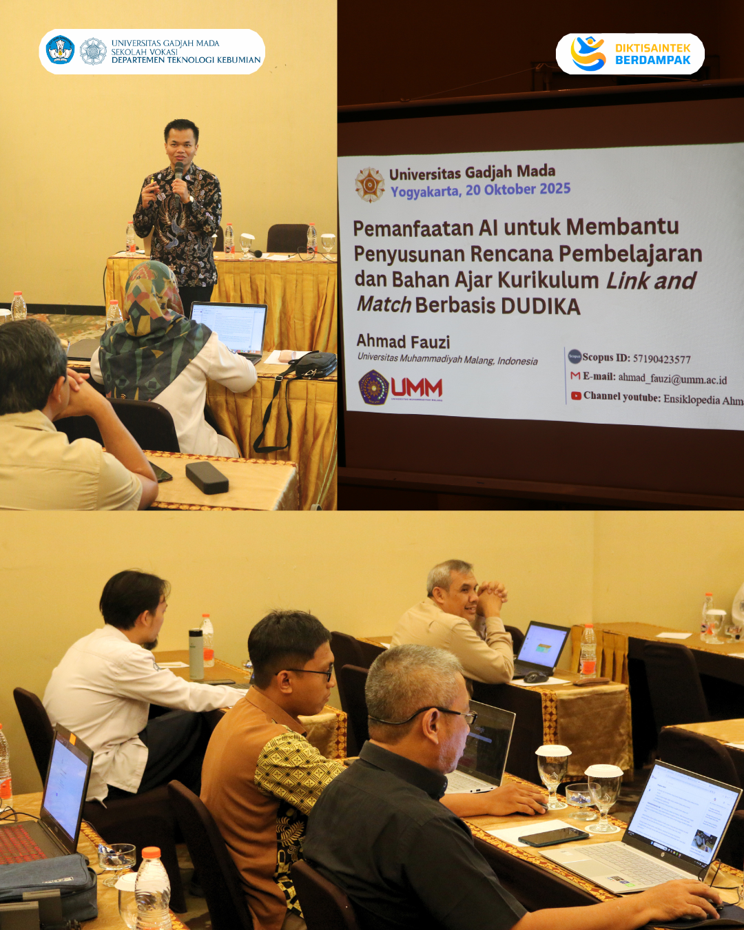 Kegiatan FGD ini dihadiri oleh para dosen dan tim pengembang kurikulum. Narasumber utama, Ahmad Fauzi, M.Pd. dari Universitas Muhammadiyah Malang, hadir memberikan materi dan pandangan terkait penerapan teknologi AI untuk mendukung proses perancangan pembelajaran vokasi yang lebih efektif, efisien, dan adaptif terhadap perkembangan zaman.